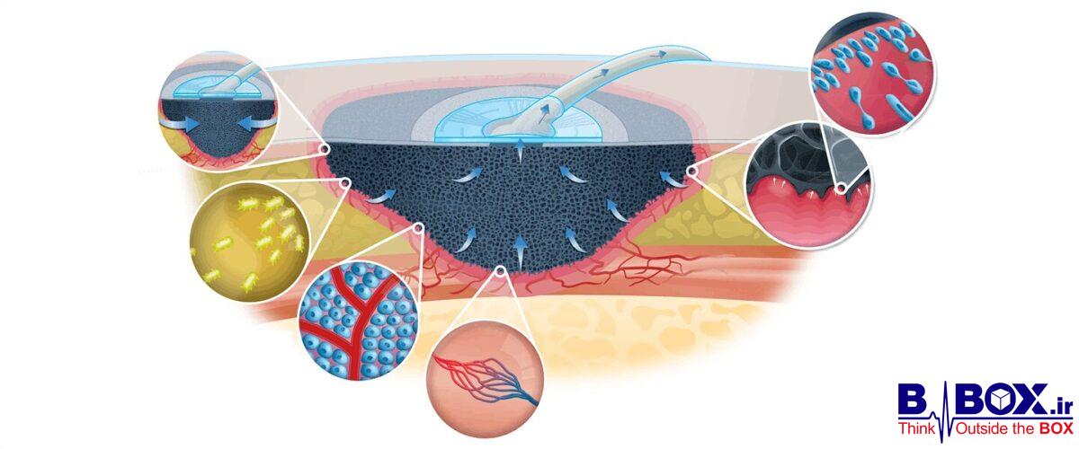 • مایعات اضافی زخم و عفونت که ممکن است سبب کاهش رشد و تکثیر سلولی شوند را جذب کرده و وارد محفظه ای در سمت دستگاه می‌کند.